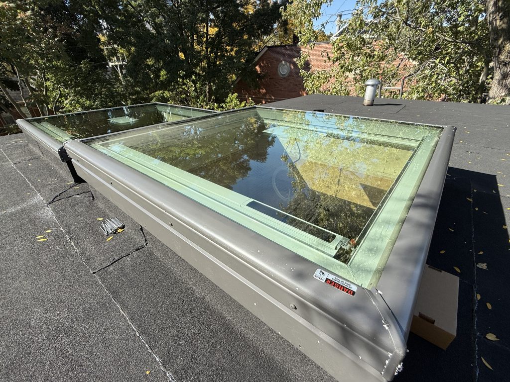 The skylight is carefully removed to expose the roof deck, allowing us to inspect for rotted wood, wet insulation, or damaged underlayment.